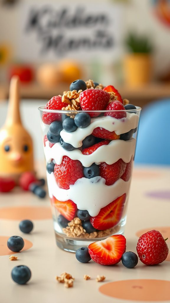 Layered with colorful berries and crunchy granola, this parfait offers a blend of textures that your child will love. Plus, it’s easy to prepare, allowing you to whip it up in no time, perfect for busy parents!