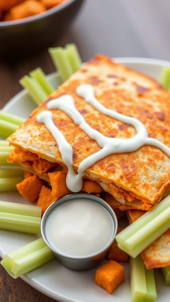 - Assemble the Quesadilla: Heat a non-stick skillet over medium heat. Place one tortilla in the skillet and sprinkle half of it with cheese, followed by the buffalo chicken mixture and some diced celery if using. Top with more cheese and fold the tortilla over.