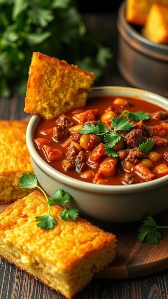 - Serve the chili hot with slices of cornbread on the side. Enjoy!