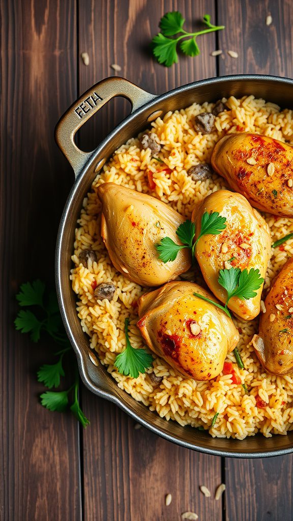 - Return the chicken to the pan, skin-side up. Bring the mixture to a boil, then reduce the heat to low. Cover and simmer for 20-25 minutes, or until the rice is cooked and the chicken is tender.
