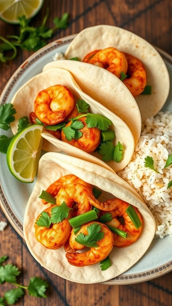 - Assemble the Tacos: Warm the tortillas in a dry skillet. Fill each tortilla with a portion of the cilantro lime rice and top with spicy shrimp.