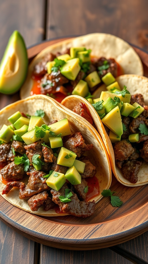- Assemble the Tacos: Place a portion of the beef on each tortilla, top with avocado salsa, and garnish with extra cilantro if desired.