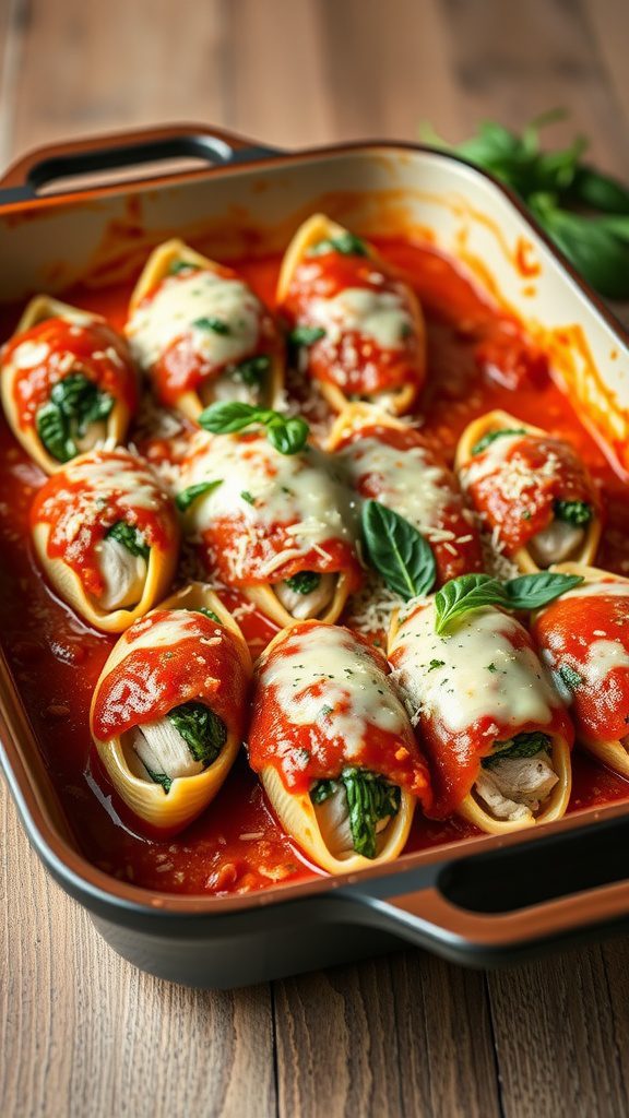 - Stuff each pasta shell with the chicken mixture and place them in a baking dish lined with half of the marinara sauce.