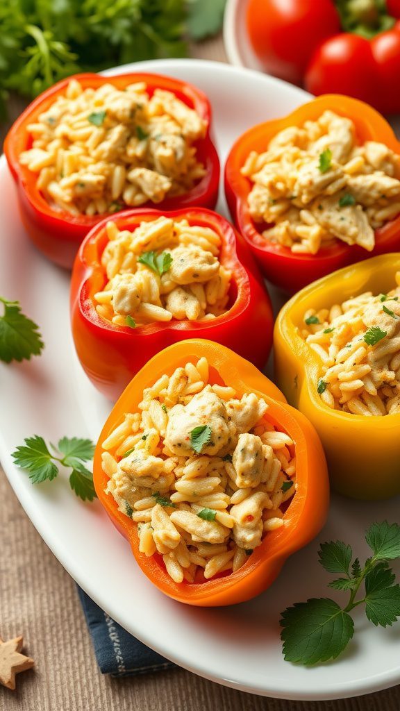 - Stuff each bell pepper with the chicken and rice mixture, pressing down gently to pack it in.