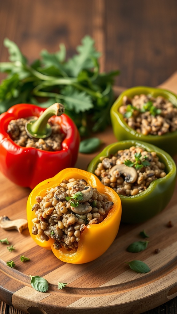 - Slice the tops off the bell peppers and remove the seeds. Fill each pepper with the barley and mushroom mixture, packing it in gently.