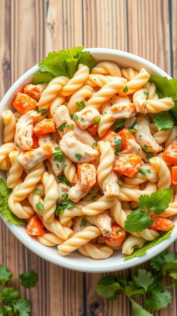 - Combine Ingredients: In a large bowl, mix the shredded chicken, cooked pasta, diced celery, carrots, and red onion.
