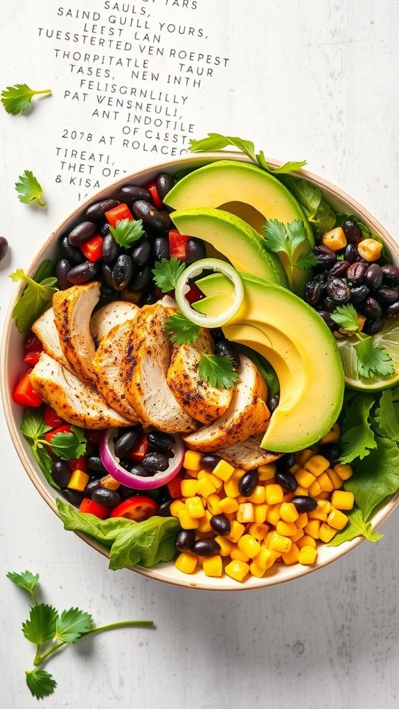 - In a large bowl, combine shredded rotisserie chicken, cooked rice, black beans, corn, chili powder, cumin, salt, and pepper. Mix well.