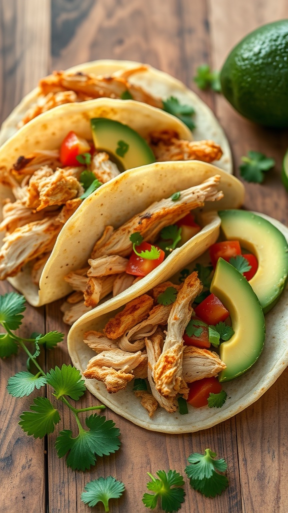 - Assemble Tacos: Place a generous amount of the seasoned chicken onto each tortilla. Top with sliced avocado, diced tomatoes, and chopped cilantro.