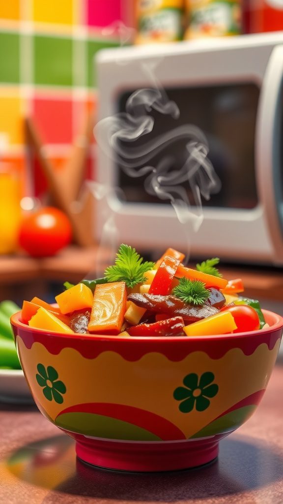- Prep the Vegetables: In a large microwave-safe bowl, combine the bell peppers, broccoli, carrots, and snap peas.