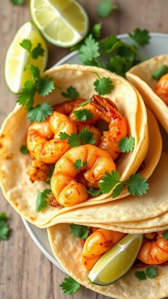 - Assemble the tacos by placing shrimp in each tortilla, garnishing with fresh cilantro, and serving with lime wedges.