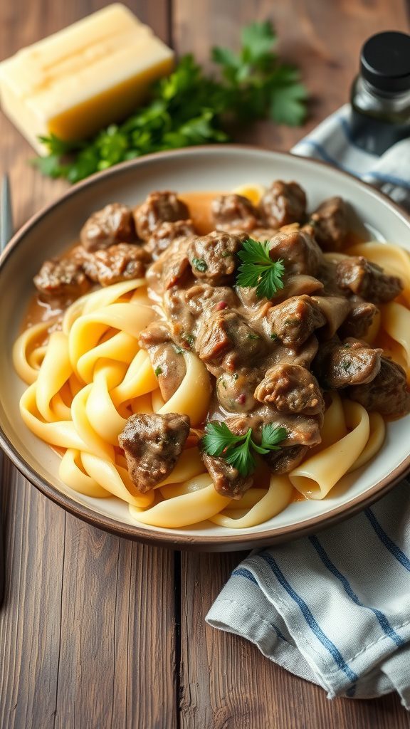 The flavors meld beautifully, with savory beef enveloped in a luscious mushroom sauce, all served over egg noodles or your favorite pasta. This dish is not only simple to make but also impressively delicious, perfect for any night of the week.