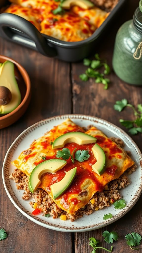 - Assemble the Enchiladas: Preheat the oven to 350°F (175°C). Spread a thin layer of enchilada sauce on the bottom of a baking dish. Place a generous scoop of the filling in each tortilla, roll them up, and place seam-side down in the dish.