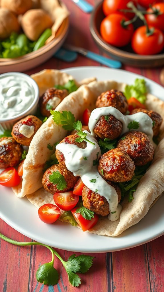 - To assemble, place a few meatballs in each pita pocket, then top with lettuce, cherry tomatoes, and a generous drizzle of tzatziki sauce. Garnish with fresh parsley before serving.