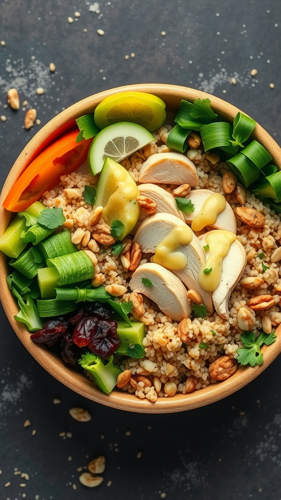 - Serve: Top with roasted peanuts for some crunch and enjoy your fresh, flavorful chicken and quinoa bowl!