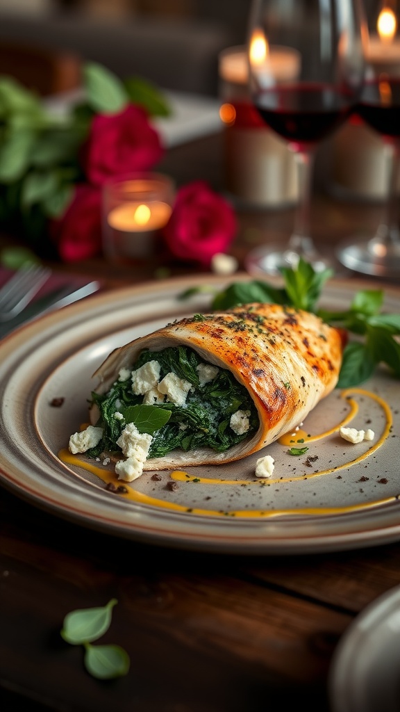 This stuffed chicken breast is a great choice for a cozy Valentine’s dinner. The combination of spinach and feta creates a delicious filling that pairs perfectly with the chicken. Serve it with a nice glass of wine for an unforgettable night.